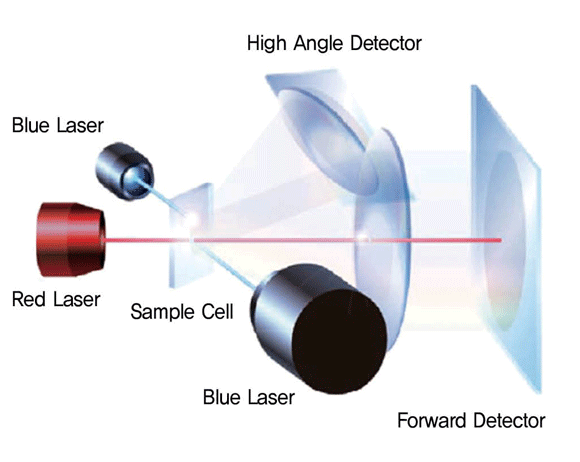 Red laser (780 nm) x 1ea 와 Blue laser (405 nm) x 2ea 을 채택하여 Submicron 및 Nano 영역의 탁월한 감도 및