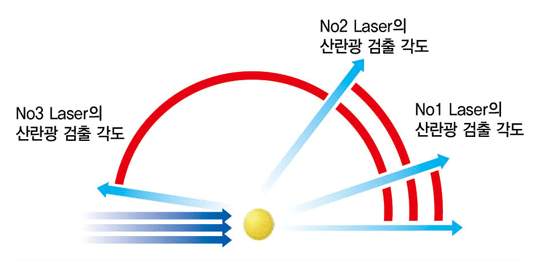 • Red laser (780 nm) x 1ea, Blue laser (405 nm) x 2ea 의 Tri-Laser system 은 0 ~ 160도에 가까운 산란광 정보를 검출